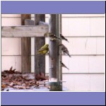 The pictures are of a bright yellow bird feeding at Niger tube feeders. Several winter plumage American Goldfinches are also on the feeders; the mystery bird appeared only slightly longer although much more plump. The head, back, and upper wings appear to be a yellowish gray while the undersides and eyebrow line are an intense yellow. In certain images (3, 10, 11), the ends of the primaries appear to show some white and black; the tail is similarly colored and slightly notched.